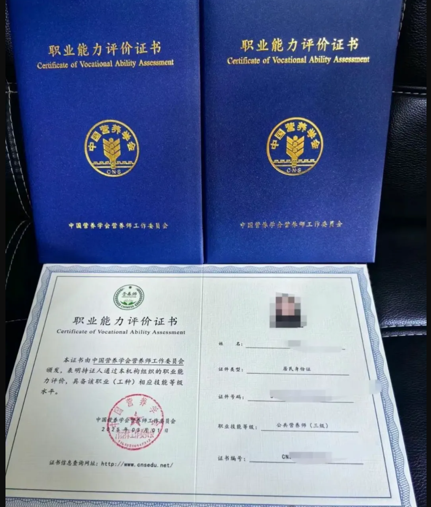 2025年起,中国营养学会公共营养师证书改版!三级四级封面统一为蓝色。